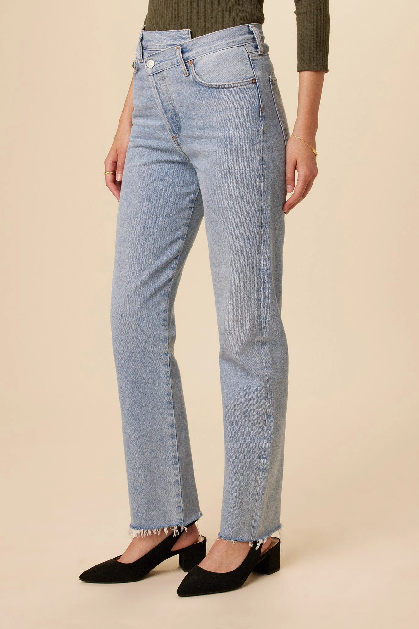 An update to AGOLDE’s best-selling criss cross fit. This true straight silhouette is cut with a high rise, offset back waistband and criss cross button-front detail.
