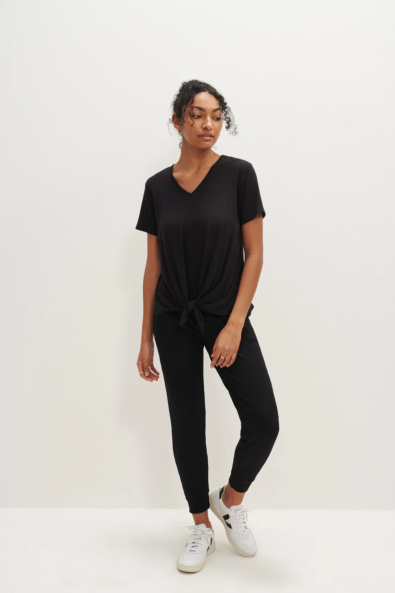 Short sleeve tee with a v-neck and fixed tie at the center front. Made in our signature, softest Dream Knit fabric.