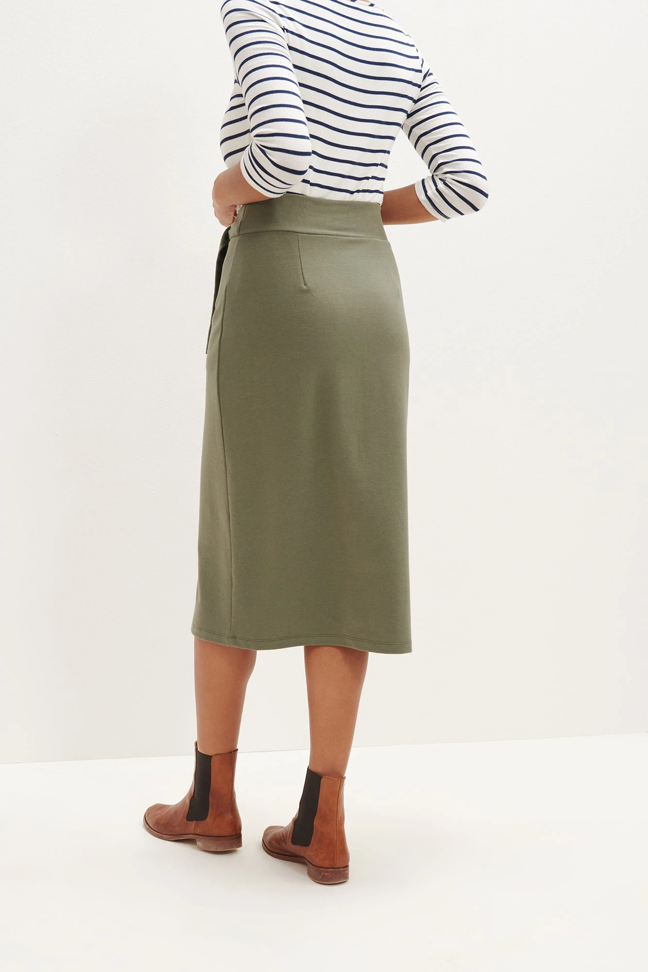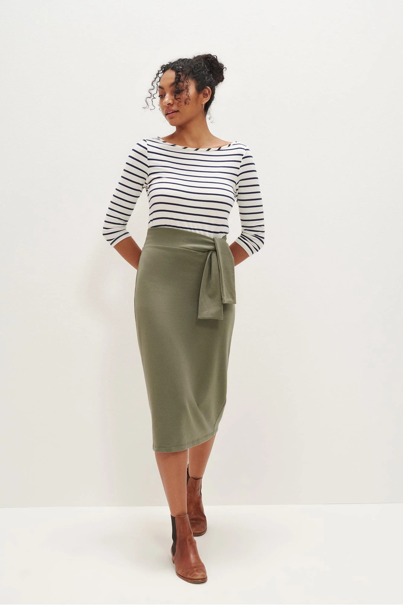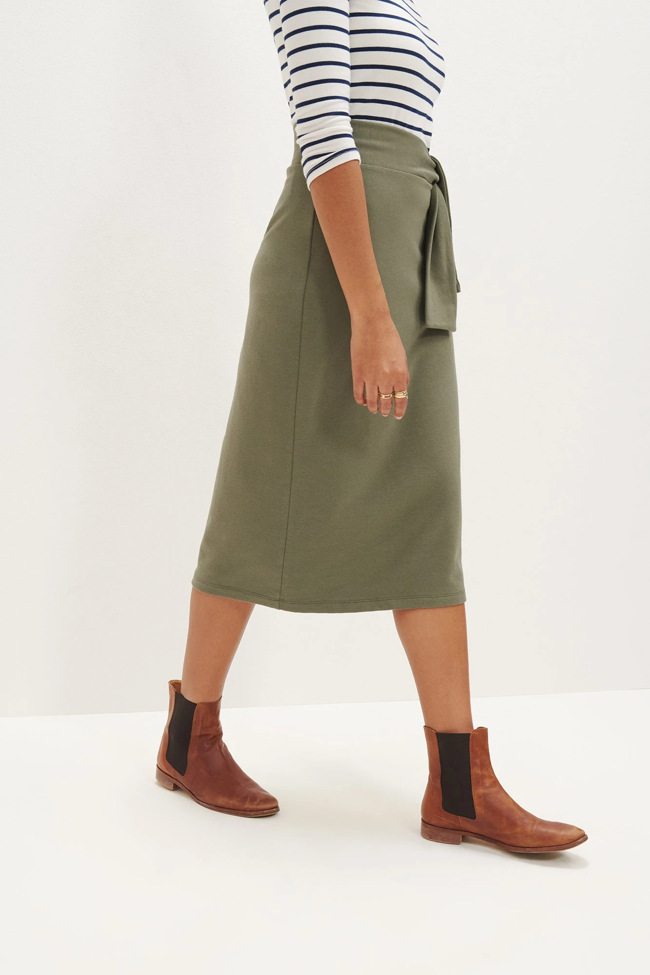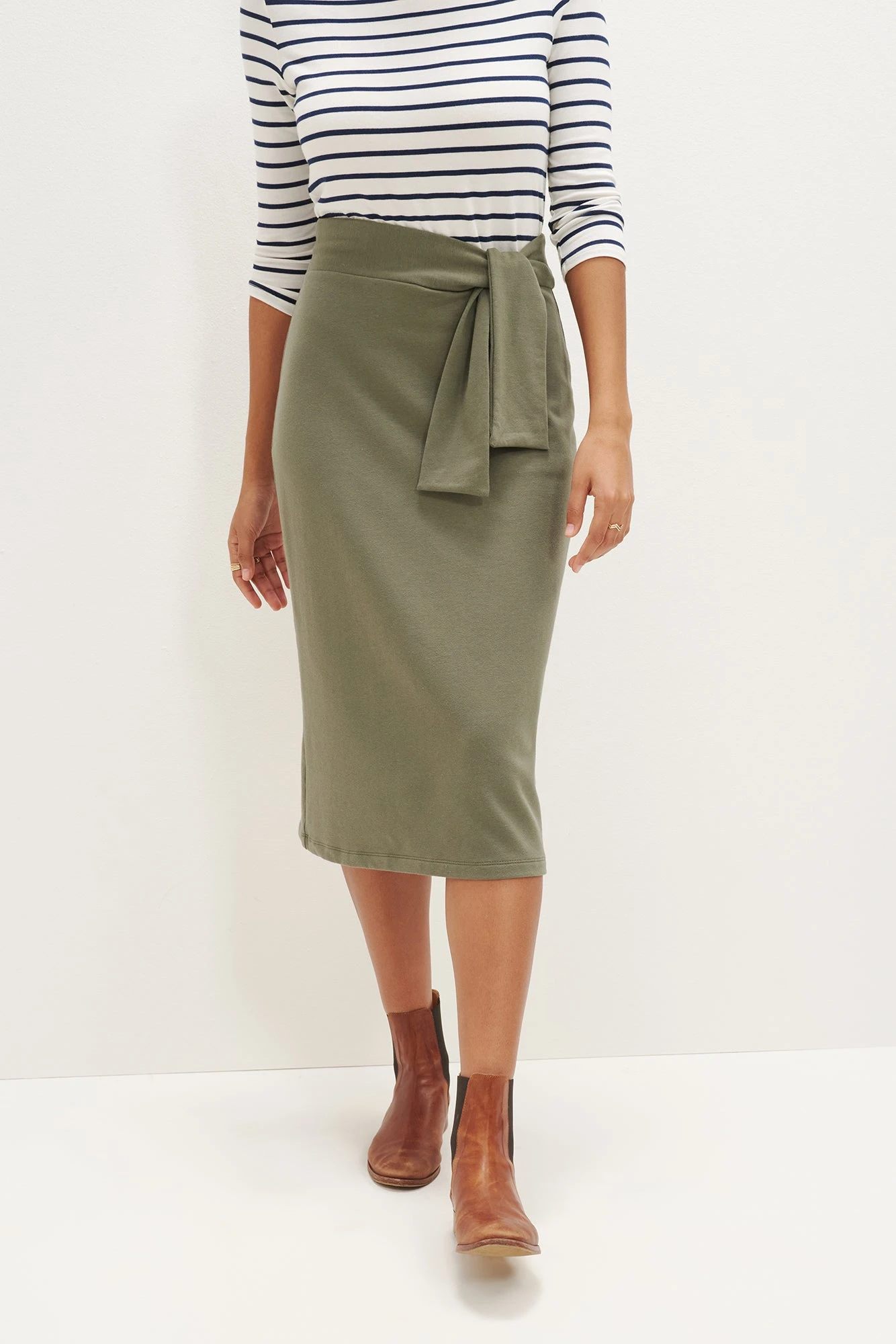 High waisted midi skirt with an adjustable waist tie. Made in Reverie Terry, our softest blend of Organic Cotton and Modal.