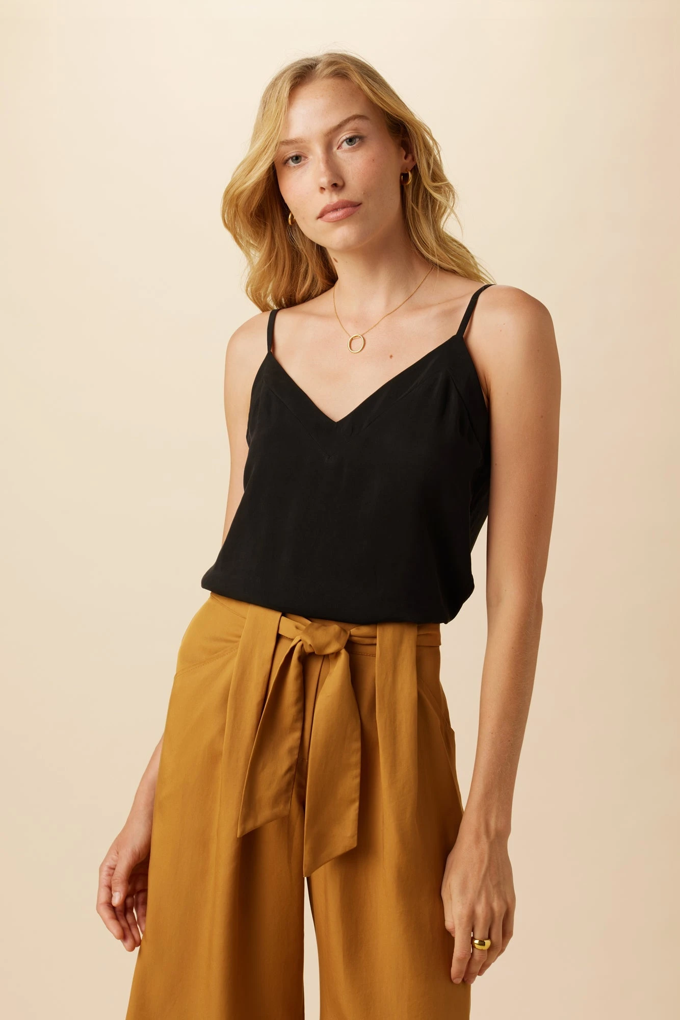Versatile cami with adjustable straps and double piecing detail. A true elevated basic that can be worn alone or layered under a blazer.