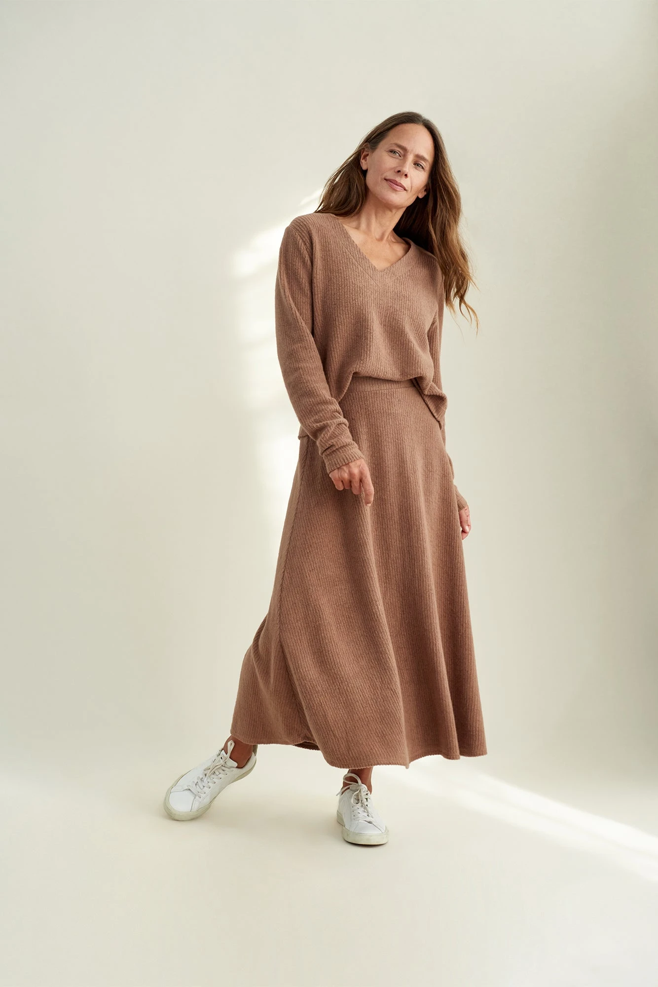 Voluminous midi skirt with a flat front and elastic waist in back. Stay soft in our dreamy Cloud Rib, a luxe blend of Organic Cotton and Modal.