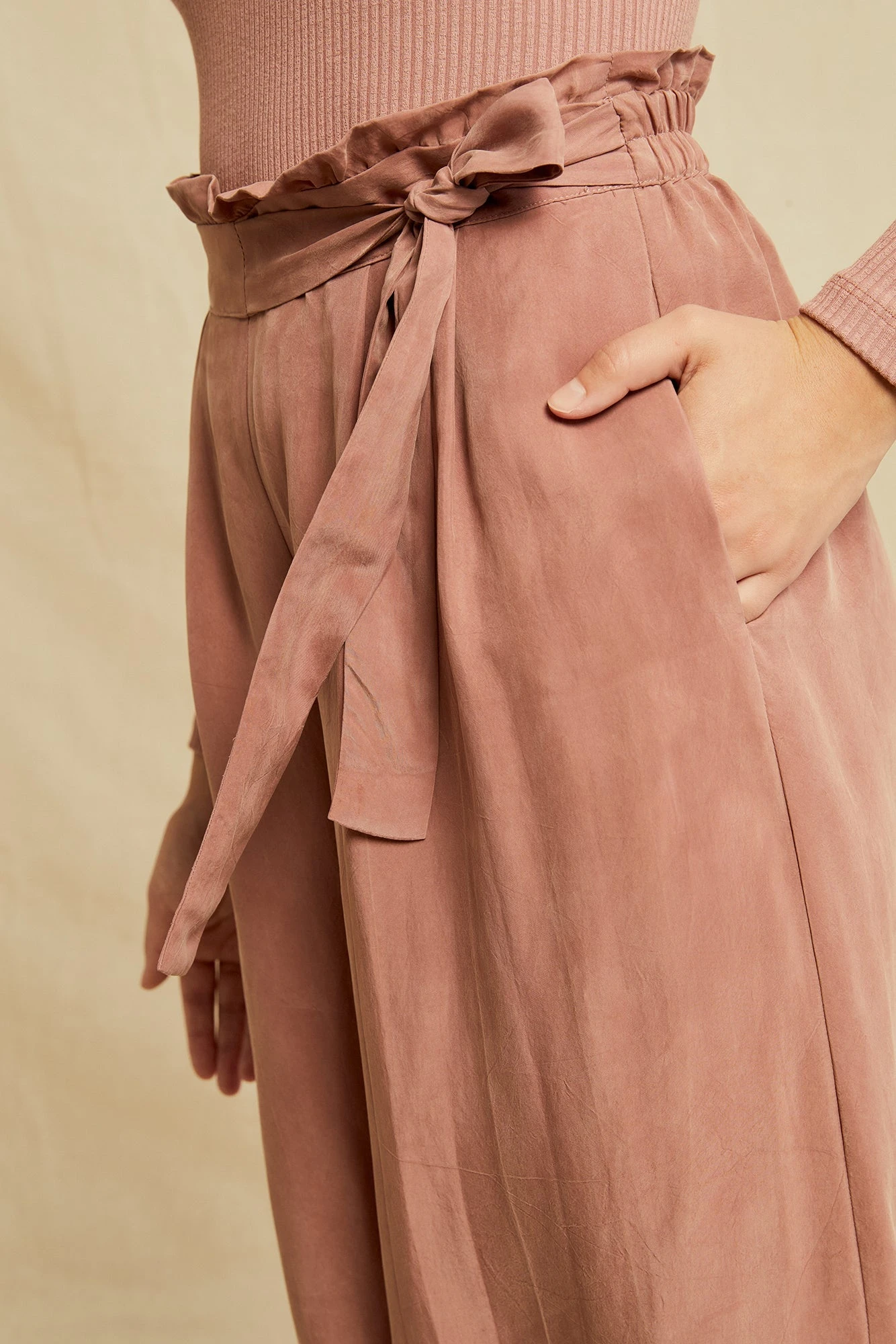 Paper bag style pant with attached side tie belt, made from our silky-soft Cottonseed Cupro.