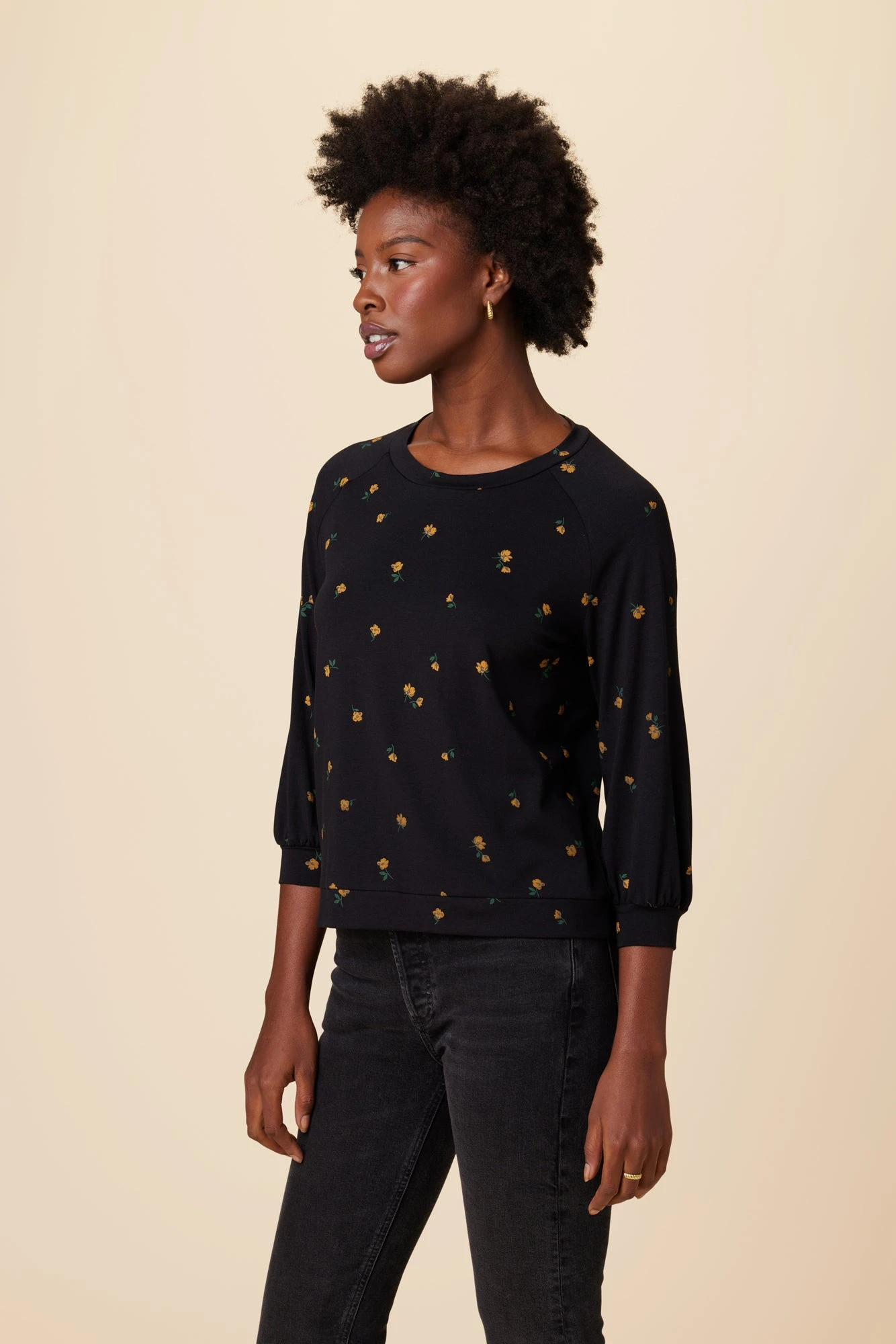 - Tee with 3/4 sleeve and gathering at the cuffs for a little added volume.
