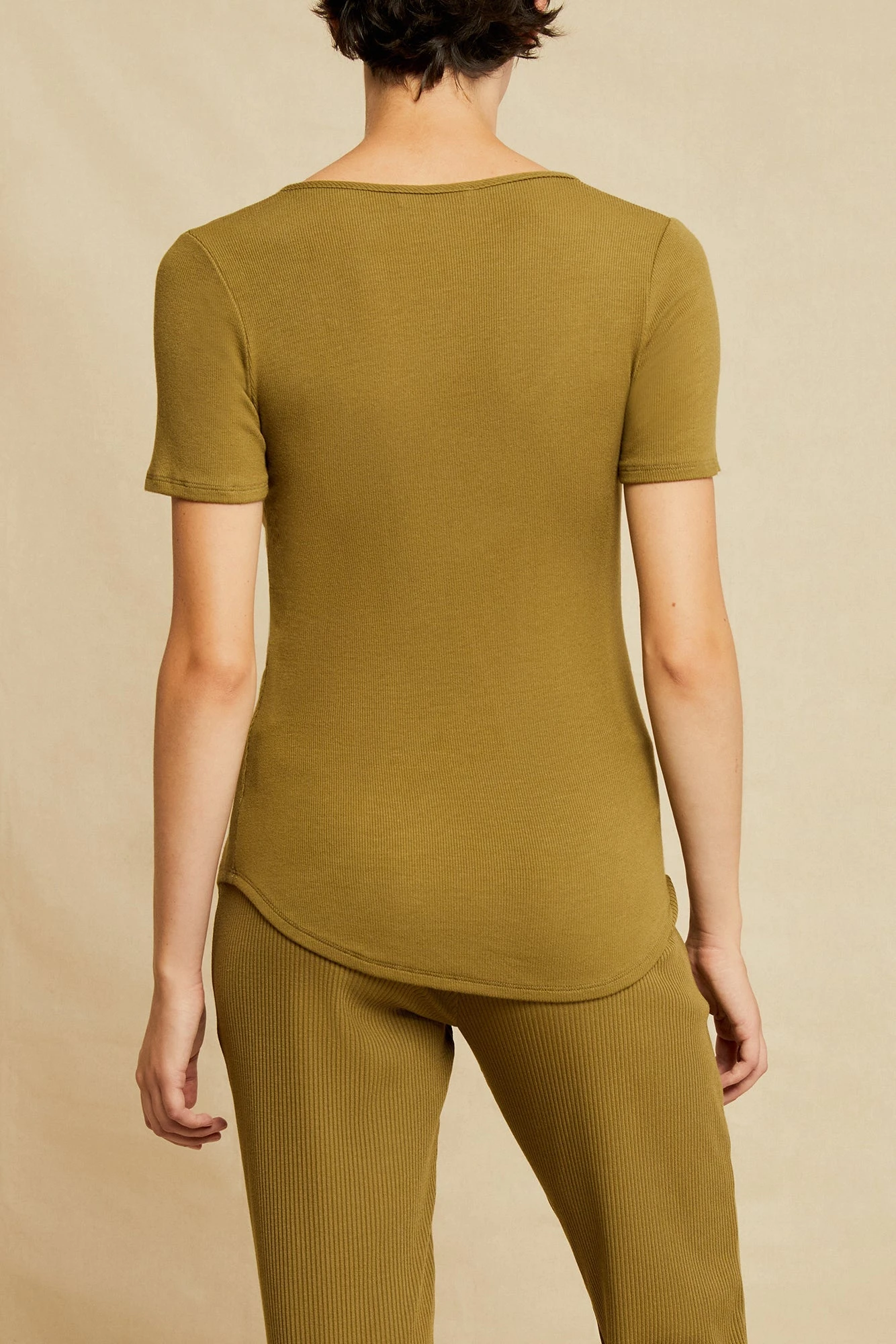 Short sleeve tee with a scoop neck and shirt-tail hem. A great layering piece made from our lightweight, super soft Dream Rib fabric.