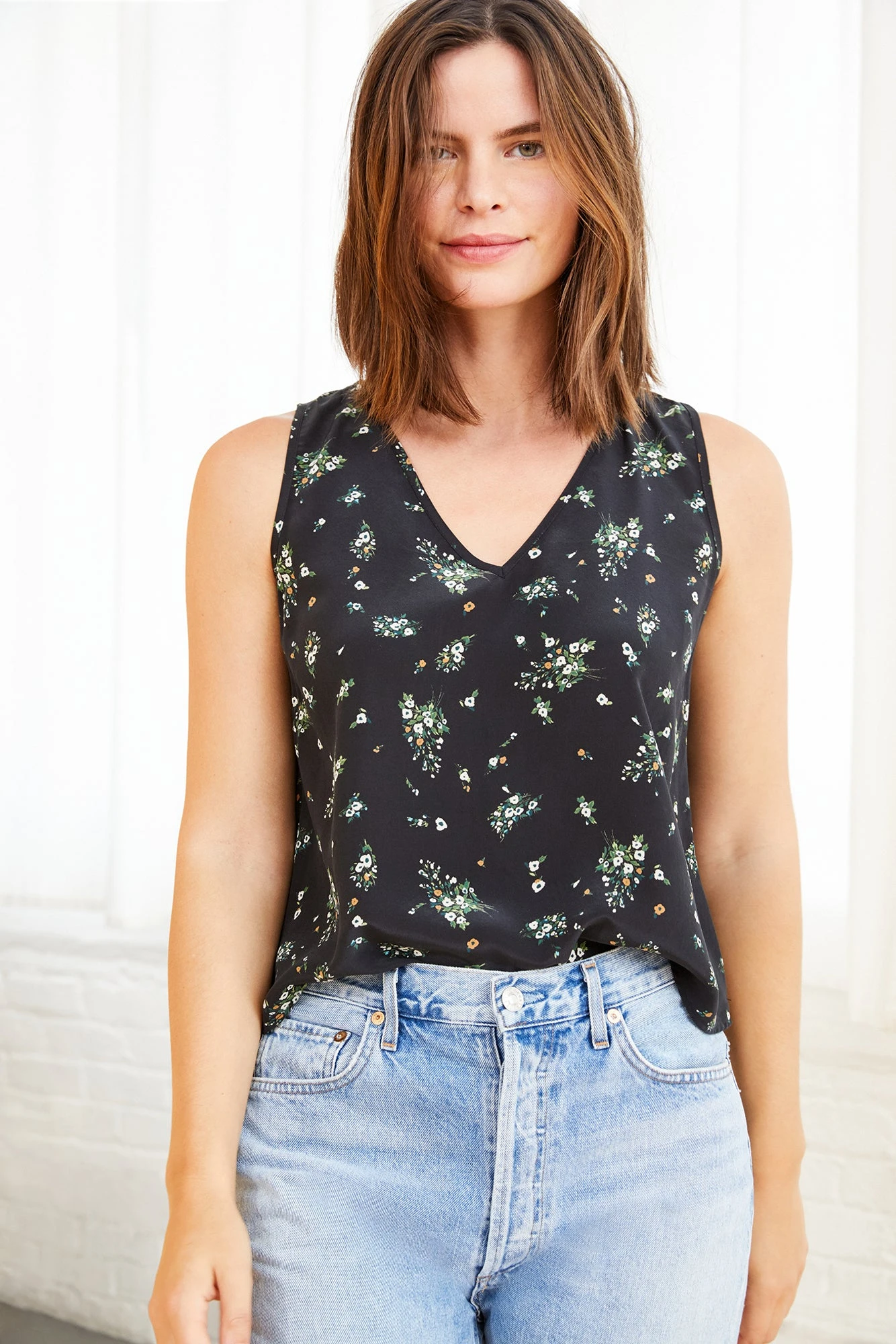 Sleeveless v-neck tank with a relaxed silhouette and slight shirttail hem. This elevated silk basic perfectly blends comfort and sophistication.