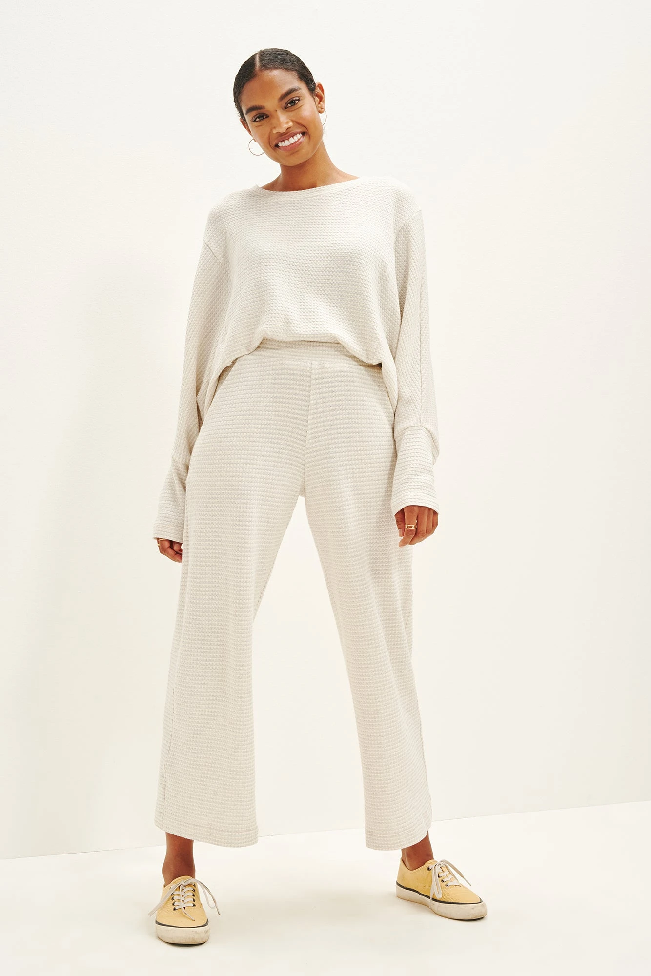 Pull-on pants with an elastic waistband, side seam pockets, and a wide leg. Made in our soft and perfectly textured Scallop Knit, these are the ultimate throw-on-and-go pants for endless occasions.