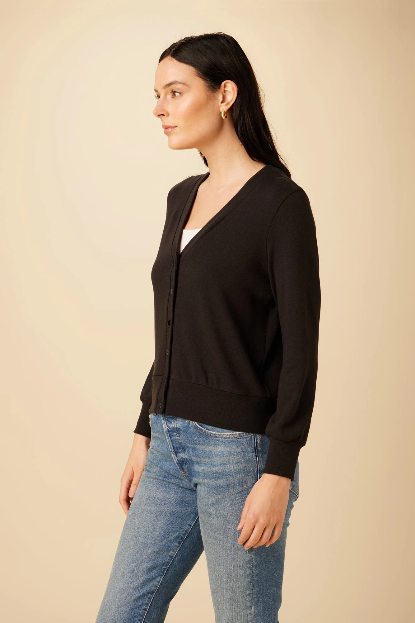 - V-neck, relaxed fit cardigan with a button front, puff sleeves and cuff.